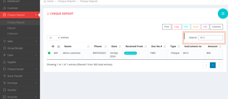 The cheque information will be available here and you can able to search the status of the cheque by clicking on the green colour plus icon.